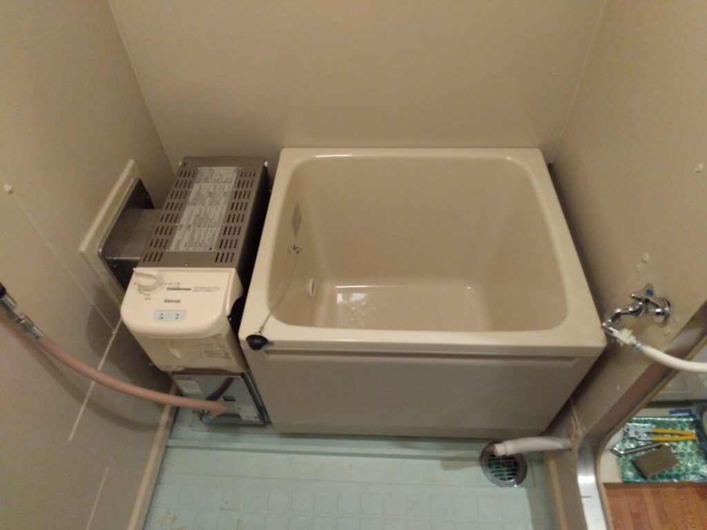 西宮市 団地 K様邸 給湯器・浴槽・シャワー水栓取替工事 ハウステック 壁貫通型給湯器 16号 フルオートWF-1613AT 浴槽 HK-1272 リクシル BF-M607H-GA 2026年4月